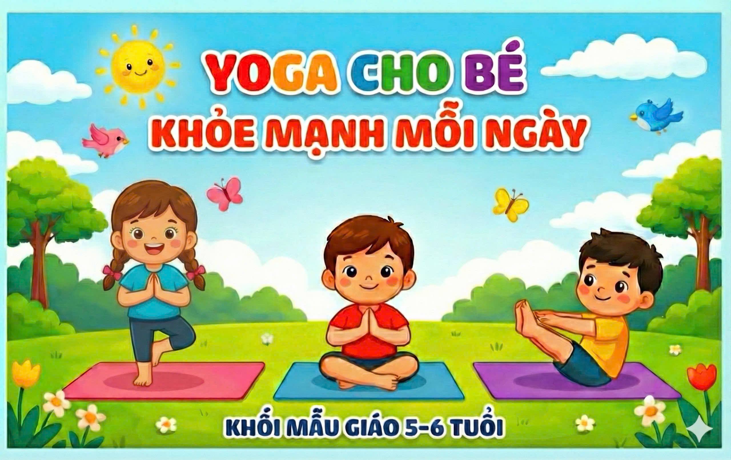 Khối Mẫu giáo 5–6 tuổi tổ chức hoạt động thể dục giữa giờ với các bài tập yoga